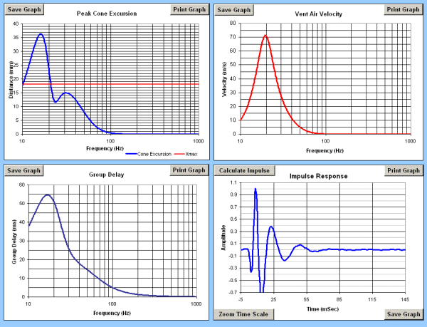 Graphs are provided that show frequency response, phase, impedance, maximum output, 2.83V sensitivity, filter transfer function, cone excursion, passive radiator excursion, vent velocity, group delay (filter, driver, and system), and Impulse Response. All calculations and graphs include the effects from the filter settings selected.